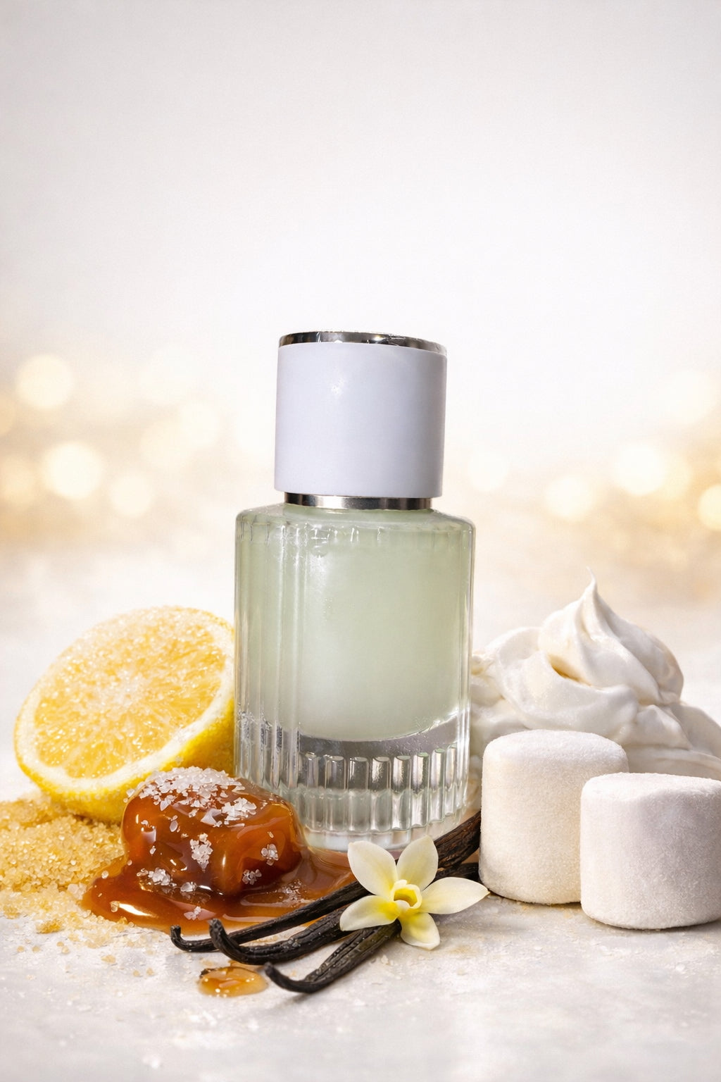 Lemon Sugar, Marshmallow, Orange, Jasmine Blossom, Coconut Cream, Vegan Ambrettolide, Vanilla Mousse, Salted Caramel, Whipped Cream