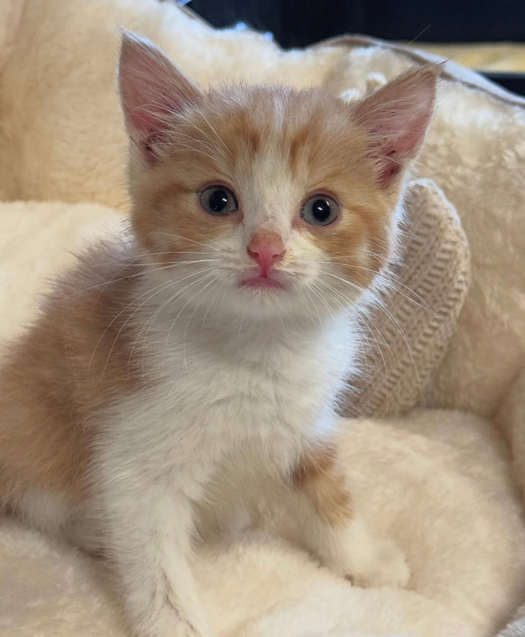 Rusty may be a little timid, but his soft demeanor and soulful gaze speak volumes. His striking orange and white coat makes him a unique presence, and he prefers the quieter corners of the sanctuary, where he can observe the bustling activity around him without feeling overwhelmed. As he grows more comfortable, we’ve begun to see glimpses of his playful side, whether it’s a tentative swipe at a feather toy or a curious exploration of his surroundings. Every small step he takes is a victory, showcasing his bravery in a world that once felt so daunting.